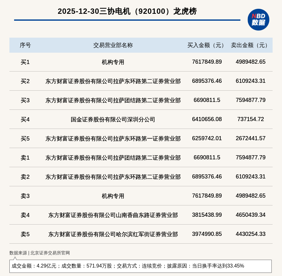 每經(jīng)訊,2025年12月30日,北交所上市公司三協(xié)電機(jī)(920100,收盤(pán)價(jià):77.59元)登上龍虎榜,交易方式是連續(xù)競(jìng)價(jià),披露原因是當(dāng)日換手率達(dá)到33.45%,成交數(shù)量571.94萬(wàn)股,成交金額4.29億元。買(mǎi)一席位為機(jī)構(gòu)專用,買(mǎi)入761.78萬(wàn)元;賣(mài)一席位為東方財(cái)富證券股份有限公司拉薩團(tuán)結(jié)路第二證券營(yíng)業(yè)部,賣(mài)出759.49萬(wàn)元。