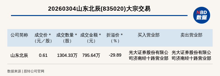 每經(jīng)訊,2026年3月4日,新三板創(chuàng)新層公司山東北辰(835020,收盤價(jià):0.87元)發(fā)生一筆大宗交易,成交價(jià)0.61元/股,成交數(shù)量1304.33萬股,成交金額795.64萬元,折價(jià)29.89%。買入營(yíng)業(yè)部是光大證券股份有限公司濟(jì)南經(jīng)十路營(yíng)業(yè)部,賣出營(yíng)業(yè)部是光大證券股份有限公司濟(jì)南經(jīng)十路營(yíng)業(yè)部。