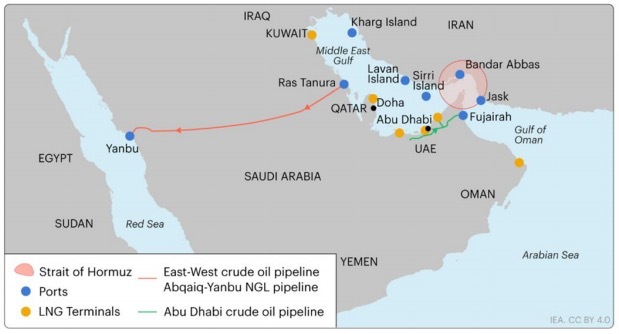 部分海灣產(chǎn)油國具備通過陸上管道繞過霍爾木茲海峽出口原油的能力。