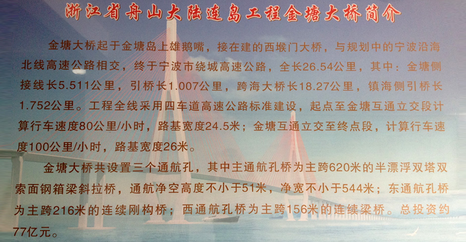 金塘大橋是舟山大陸連島工程5座橋梁中規(guī)模最大的跨海大橋,整個大陸連島工程中,二期金塘大橋與、西堠門大橋是整個舟山大陸連島工程最為關(guān)鍵一環(huán)”。